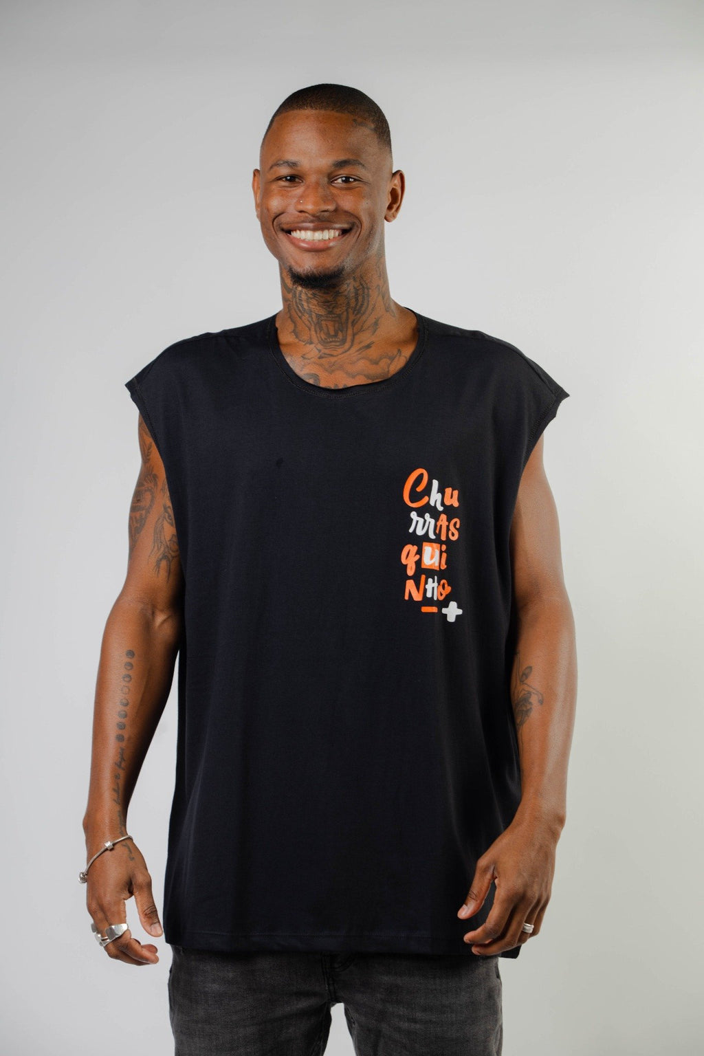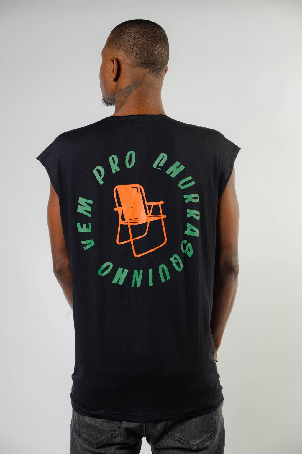 Regata Turnê Churrasquinho do Menos é Mais, feita para quem curte o clima leve, descontraído e cheio de música boa. Produzida em malha 100% algodão, com modelagem ampla e sem mangas, garante conforto e liberdade nos dias de calor ou para aquele rolê de fim de semana. Na parte frontal, o destaque fica para a estampa divertida e estilizada com o texto “Churrasquinho”, enquanto nas costas, o design exibe uma cadeira de praia laranja acompanhada da frase “Vem pro Churrasquinho”, em tipografia marcante verde e laranja — o combo perfeito de energia e descontração.
